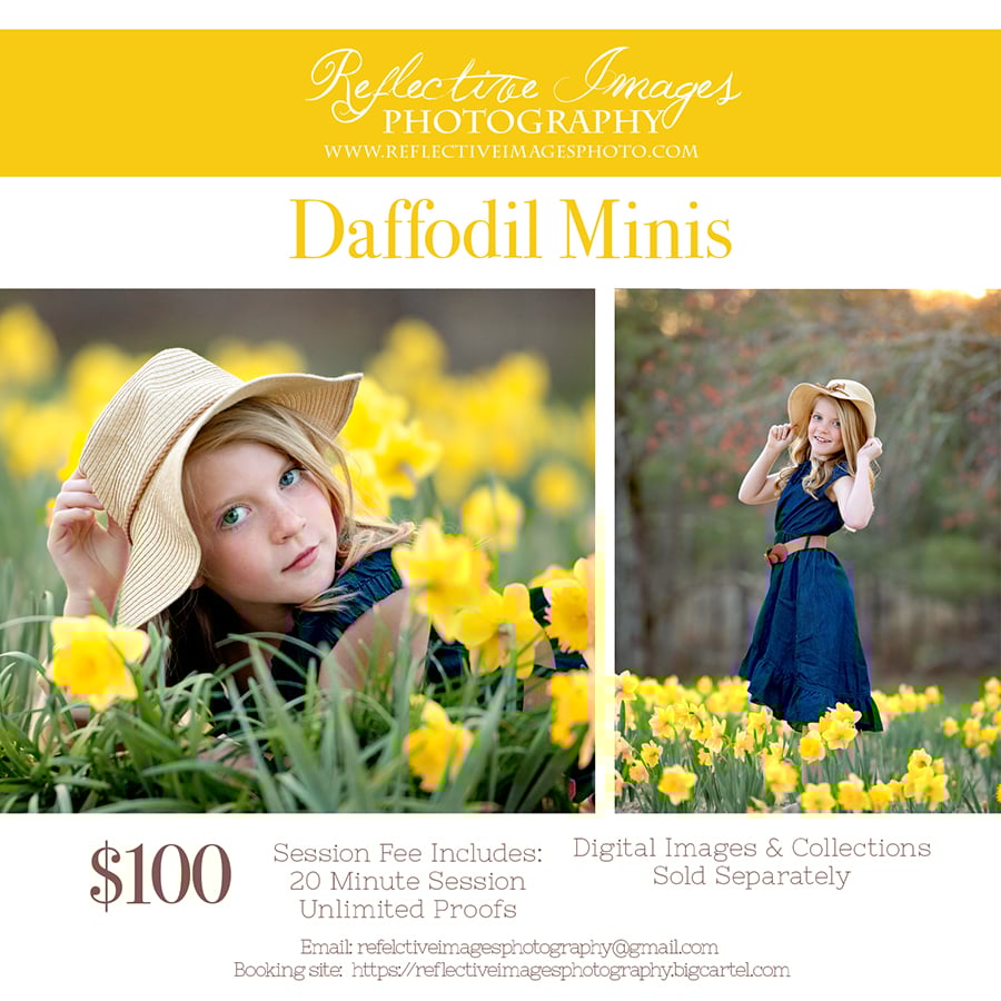**All Session Fees are non-refundable but are eligible for a one time transfer to another session with Reflective Images Photography due to illness. There is a $50 charge for any additional transfers. Any session cancelled by Reflective Images Photography for bad weather or any other reason will be rescheduled with the client at no additional charge. If for some reason the daffodils do not bloom this year, you may transfer to another session of your choice throughout the remainder of this year.
